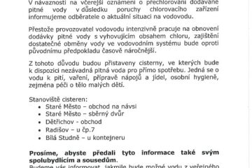 Informace provozovatele vodovodu o řešení situace s přechlorováním pitné vody. Protože obměna vody ve vodovodním systému bude časově náročnější, dude u obchodu přistavena cisterna s nezávadnou pitnou vodou pro přímou spotřebu. 20251007091732800